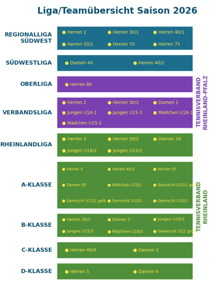 Der TC Blau-Weiß Bad Ems startet mit insgesamt 41 Mannschaften in die Saison 2026 und stellt damit die größte Meldezahl im Tennisverband Rheinland. Von der Regionalliga bis zur D-Klasse ist der Verein in sämtlichen Spielklassen vertreten. Noch vor 30 Jahren war lediglich ein vergleichsweise kleiner Teil der Vereinsmitglieder im Mannschaftsspielbetrieb aktiv. Heute hat sich dieses Bild grundlegend gewandelt: Nahezu 60 Prozent aller Mitglieder beteiligen sich an der kommenden Medenrunde und tragen die Vereinsfarben des TC Blau-Weiß Bad Ems mannschaftsangebunden auf dem Platz. In Bad Ems zeigt sich damit ein ausgewogenes Bild des Tennissports: